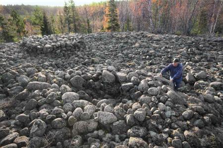 Fornminne, Bodholmen på Värlax.Klapperstenfältet innehåller ett tiotal sälfångstrelaterade anläggningar. Alf Svahn vid ett stort, troligt förvaringsröse för sälfångst. Röset i bakgrunden är svårtolkat och mycket ovanligt röse. Höjdnivån (15 m) och brant topografi ger en tusenårig datering. Foto Mikael Herrgård.