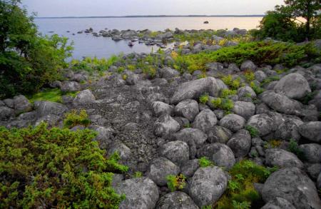 Fornminne, båtlänning (hamn) på Kolaningen, Mickelsörarna. På den lilla holmen finns många lämningar efter fiskare och säljägare. Foto Mikael Herrgård.