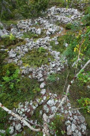 Fornminne, tomtningar på Kummelskärs stora 1500-tals fiskeläge på Mickelsörarna. Tomtningarna, idag mitt på holmen, var försedda med ordentliga stenröjda hamnar. Foto Mikael Herrgård.