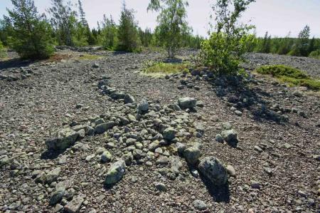 Fornminne, skadad kompassros på Sillskatans (Märaskär) 15-meters krön på Mickelsörarna. De många olika lämningarna tyder på sälfångst. Foto Mikael Herrgård.