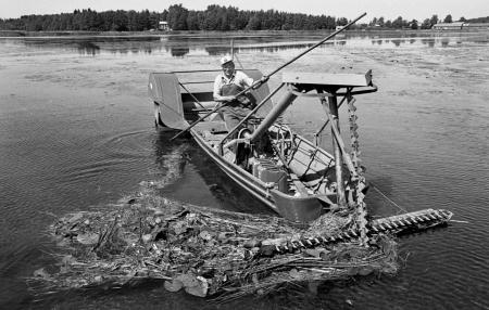 Klippning av sjöväxt 1978 på Vassorfjärden. Alvar Hellman kör den nya maskinen som har fått många efterföljare på våra ständigt uppgrundade fjärdar med rik växtlighet. Foto Mikael Herrgård.