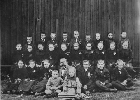 Kantor Isak Sandbäck (1864-1906) i Kvevlax. På bilden från början av 1900-talet sitter hans barn Ingeborg och Kurt framför. Sandbäck var mångsidig, omtyckt och ledde bla. körer. Uppgifter om gruppen med ungdomarna saknas, kanske är det en kör?