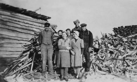 Klackfabriken. Från vänster Johannes Rönnqvist, Hjördis Östman, Frida Östman. Bakom två namnlösa damer, Harald Sanders, Alfred Audas. 1900-talet