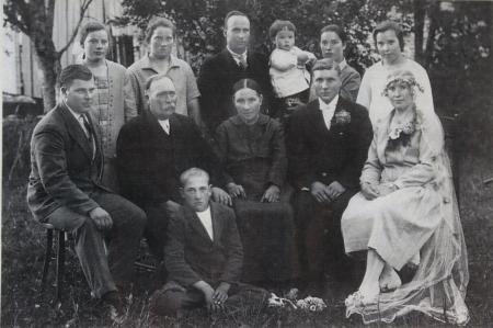Bröllopet mellan Signe Svahn och Ernst Nordin 1927. Brudens familj uppe från vänster: Jenny Svahn, Ester Svahn, Jakob och Aina Vörgren med sonen Ruben i famnen, Ida Svahn. Nedre från vänster: Evert Svahn, Abraham och Matilda Svahn. Sittande på marken Gunnar Svahn.