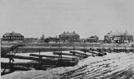 Furunäsbacken (Funisbackan) i Kvevlax. Från vänster Kvevlax Ungdomsförenings hus som brann 21.1 1940. Armén tillverkade rökgranater som antändes. I mitten Kvevlax manliga hemslöjdskola (med smedja) som utbildade smeder, snickare och målare. Revs 1981. Höger, Kvevlax kyrkoby folkskola. Ombyggd på 1980-talet. Idag Kvevlax lärcenter. Nedanför: Johanna Mickelsdotter Helenius stuga och vedlider.