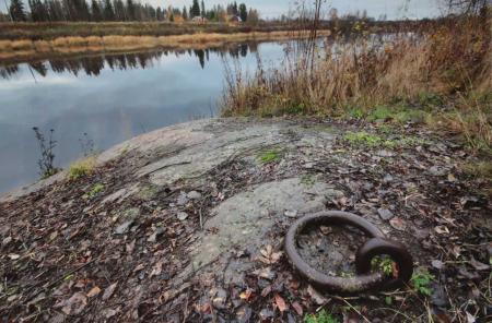 Järnring i berget vid Svarvarshällorna i Voitby (2011). Ringen användes vid flottning av virke i Kyro älv. Foto Mikael Herrgård.