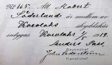 Skyddskårs medlemskort Nr 165 för Robert Söderlund Kvevlax 1919. Utfärdat av Anders Pass och John Sederström.