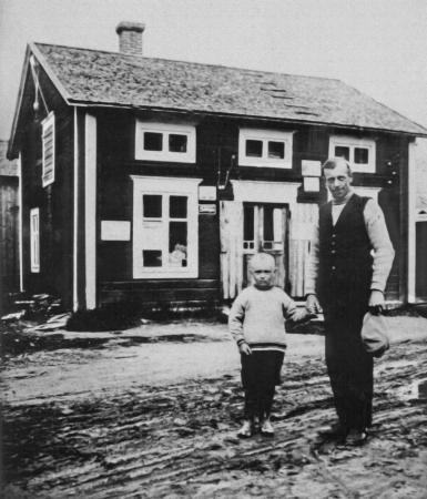 Edvin Herrgård med sonen Per-Erik framför handelsboden i Kvevlax centrum. Början av 1930-talet.