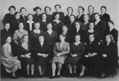 Kvevlaxmarthorna 11.4 1952. Första raden från vänster: Edna Norrggård, Ethel Henriksnäs, Ester Norrgård, Edit Nygårds, Greta Bergman, Linnéa Knipström Hjördis Vikström. Andra raden: Hilda lunelund, Agnes Ahlskog, Anna Blomberg, Gunhild Stenman, Hilda Hurr, Bertha Planman, Valdine Storfors, Ines Paro. Tredje raden: Ruth Ekman, Hildeborg Hurr, Sennie Ahlskog, Gerda Almén, Elsa Hurr, Sylvia Vistbacka, Regina Hurr, Fjärde raden: Rode Nässlin, Adele Svarvar, Gun-Britt Erikson, Vera Rönnqvist, Dagny Björkman, Elsie Herrgård, Annie Herrgård, Inga Wiik, Jenny Jakobsson.
