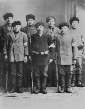 Bondearmén 1918. Främre raden från vänster: Emil Hjort, Edvard Knip, Arvid Svarvar. Bakom: Johannes Berg, Verner Hurr, Isak-Erik Knip (Nyysto), Ernst Ekholm. Samtliga från Kvevlax.
