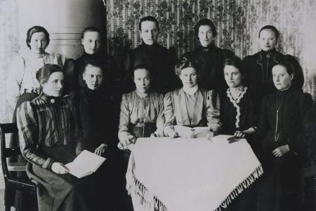 Nedre: Edla Brännmark (Nyysto Edla), Signe Knip (Väktas Signe), Johanna Wiik (Viikens Hanna),