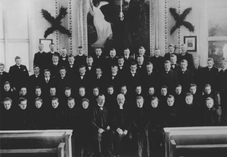 Skriftskolan 1909. T. f. klockare Erik Nylund, t. f. präst?. Identifierade konfirmander: Matilda Frantz, Anna Olivia Hagberg, Johanna Adelina Smedman, Johanna Olivia Sander, Hilma Maria Nyman, Ester Ahlman, Signe Maria Karlsdotter Knip, Maria Ekholm, Matilda Lunelund, Alfred Audas, Alfred Thure; Isak Erik Qveflander, Johannes Redlig, Gustaf Edvin Svarvar, Verner Hjort, Karl Alfred Blomberg, Vilhelm Edvard Källskata, Alfred Hake, Alfred Strand.