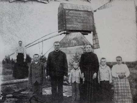 Erik Andersson Flinkfelt, f. 1847 i Vassor. Familjen samlad vid väderkvarnen på Flinkis backan i Vassor.