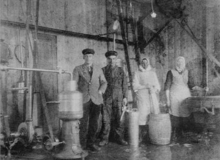 Mejeriet på Herrgårdsbacken (Stormatt) startades av Sigfrid Kuniholm vårvintern 1929. Redan den 14 april förstördes byggnaden av en eldsvåda. Vänster: Kuniholm, Arvid Jakobsson, kvinnorna är okända.