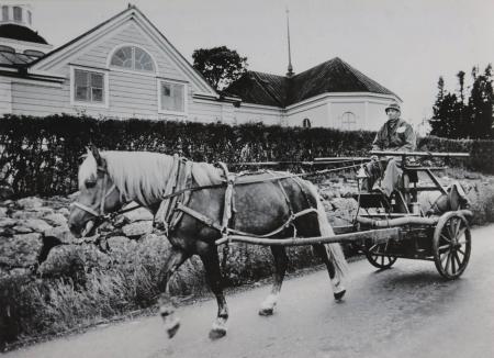 Gamla brandsprutan förs till sockenmagasinet (museeum) i juli 1976. Harry Hurr på kuskbocken. Foto Mikael Herrgård.