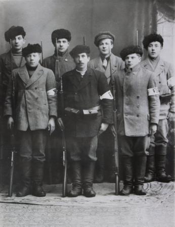 Bondearmén 1918. Första raden vänster: Emil Hjort, Edvard Knip, Arvid Svarvar. Andra raden: Johannes Berg, Erik Verner Hurr, Isak-Erik Knip, Ernst Ekholm. Alla från Kvevlax.