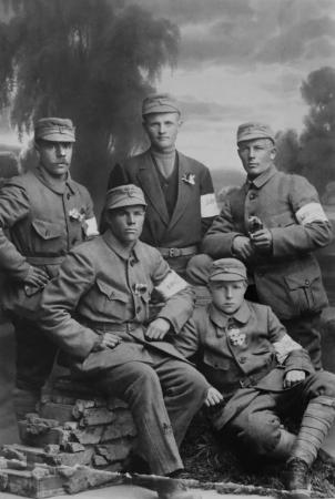 Främst: Hugo Kalander till höger, den andre okänd. Bakom: okänd, Verner Sand, Viktor Majors.