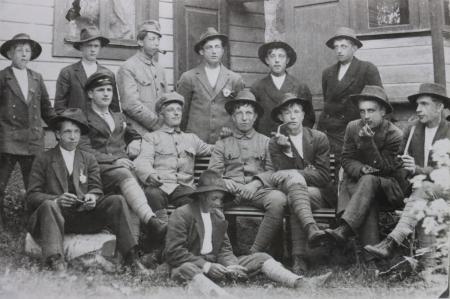 Bild tagen omkring 1919 av fotograf Anna Hanelius vid gamla klockargården (ateljé). Övre raden från vänster: Evert Holm, Verner Knip, Alfred Enlund (Karlsson). Nedre raden: Fritjof Hagberg, Oskar Knip, Julius Hedqvist, Johannes Sandback, Evald Knipström, Arvid Jakobsson och Johannes Källskata. Framför: Harald (Källskata) Eriksson.