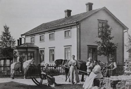 Bild från Herrgårdsbacken omkring 1910. Huset tillhörde Maria Wiik och stod kvar till 1960-talet. I gungstolen sitter Johanna Rimström (Riimas mosson1843-1921), född Lustig (från Sandelins) och änka efterAbraham Rimström. Vid sidan står dotterdottern Signe Knip (1893-1991) som gifte sig 1913 med Alfred Botolf Nygård. Kvinnan med sonen Albin är Riimas mossos dotter Maria Wiik (f. 1865). Hon har vistats en tid i Amerika där sonen föddes 1908. Mannen med hästen och slåttermaskinen är troligen Anders Rimström (f. 1870), son till Riimas mosson. Till vänster Karl Herrgård (f. 1891) på hästen "Riimas Viitin". Källa: Signe Nygård (Knip).