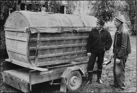 Trosskorg, troligen från 1808-09-års krig. Alf Svahn och Levi Almén vid korgen, som Almén köpte av Bertel Snickars vid Golkas kvarn. Motsvarande bevarade fynd saknas. Korgen finns i Museum Magasinet i Kvevlax.