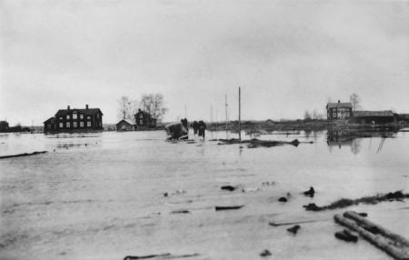 Översvämning vid forna Stranden 1937. Bonäsöurin till höger. Till vänster gamla Bränneriet, sedan vävskola - som fick nybyggnad. Lilla huset: Beata och Helga Knips hus