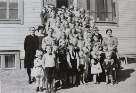 Elimkapellets trappa: gemensam söndagsskolavslutning för Elim- och Friförsamlingen i mitten av 1940-talet. Lärarinnor är från vänster: Ester Westerman, Dagny Berg, Hulda Paro, Irene Paro.