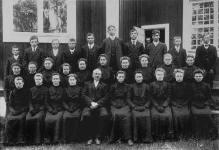 Skriftskolan i Kvevlax 1912. Kyrkoherde Evald Erland Hemmer. Identifierade: Karl Albert Hildén, Johannes Werner Sederström, Johan Oskar Knipström, Werner Bergendahl.Karl Magnus Frants, Johannes Norrholm, Anna Maria Lustig.