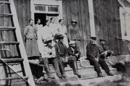 På trappan vid Tontas (Enroth) stuga. Övre raden från vänster: Matilda Enroth, Anna Helenius, Maria Enroth, Signe Knipström, Edla Enroth, Johannes Valbäck. Sittande: Evald Knipström, Johannes Enroth, Albert Nygård, Johan Gabrielsson Enroth (Tontasgobbin), okänd.