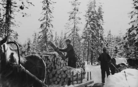 Per-Erik Herrgård, Harry Knip och Mikael Herrgård kör pappersved med tre hästar från skogen väster om Byträsket. Tidigt 1960-tal. Foto Mikael Herrgård.