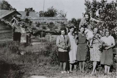 Damer i Kvevlax centrum. Från vänster: Elvi Knip, Elli Häggblom, Edit Hägglund, Jenny Lustig, Dagny Knuts (ovan), barnet är Ellen Hermanssons dotter, Sigrid Norrgård, Hildur Hermansson.