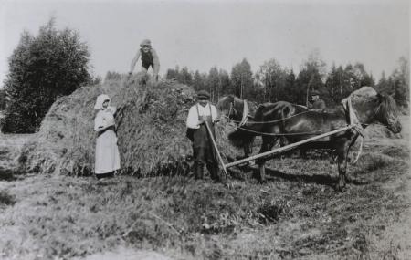 Höbärgning vid Vinterviken i Mälsor 1922. Från vänster Anna Hagberg, Albin Frantz, Fritjof Hagberg, Johan Hagberg.