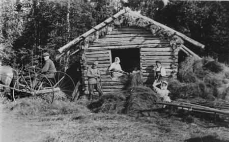 Höbärgning vid Vinterviken i Mälsor 1922. Från vänster: Johan Hagberg, Karl Nickull, Anna Hagberg, Gunhild Grönvik (gift Finell), Fritjof Hagberg, Naimi Sandlund.