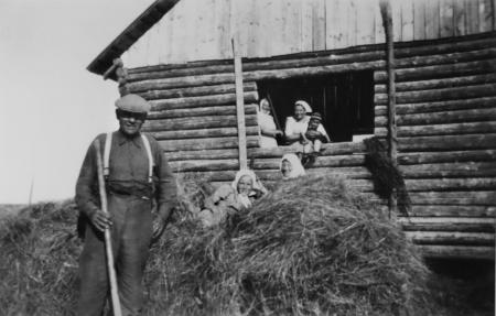 Höbärgning vid Brännas 1951. Från vänster: Verner, Greta, Elsa. I ladugluggen Ida, Hildeborg, Per-Olof.