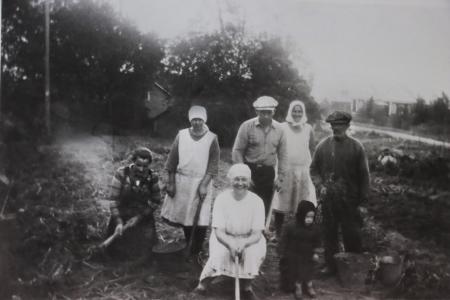 Potatisupptagning på Tranasbacken hos Backas (kyrkan skymtar till höger). Från vänster: Ingrid Eriksson, Ida Källskata, Harald Eriksson, Hilda Knip-Lunelund, Isak-Erik Källskata. Främst: Elin Holmberg (vävlärarinna), Martin Eriksson (Ingrid och Haralds son).