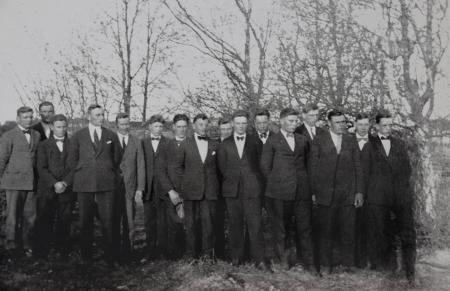 Slöjdskolan våren 1925. Från vänster: 1 okänd, 2 okänd, 3 Evert Lustig, 4 Gustav Nordman, 5 Johannes Rönnqvist, 6 okänd, 7 Valdemar Paro, 8 okänd, 9 okänd, 10 Arne Hurr Nygårds, 11 Oskar Eriksson, 12 okänd, !3 Verner Enlund, 14-16 okänd.