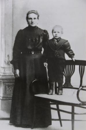 "Skäri Mari", Maria Sofia Abrahamsdotter Gammal (1874-1937) f. 1874 i Replot, d. 1937 i Kvevlax. Vigd 1895 med Gustav Varg från Västerhankmo. Maria använde tillnamnet Åkerblom i Kvevlax. Hon hade två söner, Gustav och Artur. Troligen Gustav på bilden.