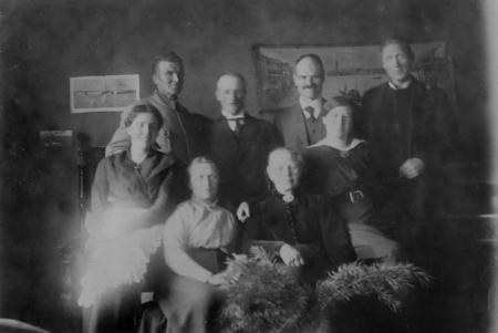 Från vänster: Erik Jansson, Johannes Nyqvist, K V Åkerblom, FransKlefström. Nedre: okänd, Alexandra Åkerblom, Hanna Klefström, okänd.