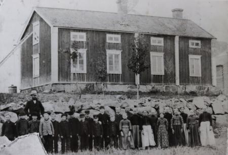 Det äldsta skolhuset på Funisbacken i slutet av 1890-talet, lärare Jakob Schultz.