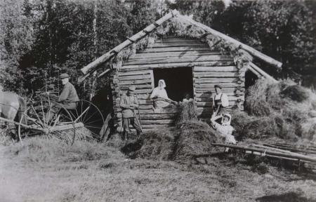 Johan Hagberg på räfsan. Karl Nickull i uniform, Anna Hagberg och Gunhild Grönvik i ladudörren samt Fritjof Hagberg och Naemi Sandlund. Vinterviken i Mälsor 1922