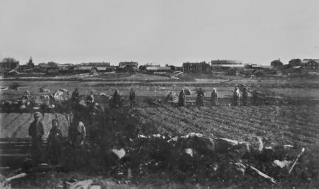 Potatisupptagning i Öuråkern i början av 1900-talet. Bilden är tagen från Funisbacken.