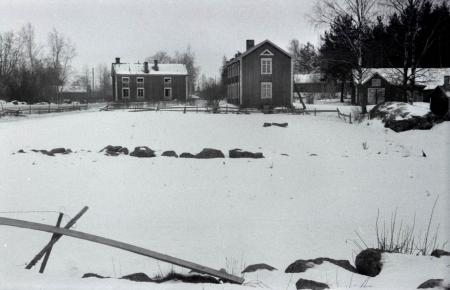 Bild från ca 1970. Ahlis tomma gård på Tranasbacken till vänster. Ahl flyttade till Mälsor efter nyskiftet. Till höger Beijaris bebodda gård. I mitten ses klockstapelns och kyrkans spiror. Foto Mikael Herrgård.
