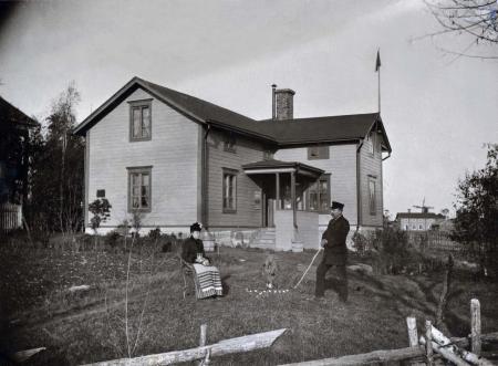 Kvevlax gamla klockargård i slutet av 1800-talet. Klockare: Johan Vilhelm Hanelius (1854-1900). Hustrun Anna inrättade fotoateljé i hemmet efter makens död. Prästgården skymtar till vänster. Till höger ses Erik Knips (Nysto) butik och en väderkvarn på Tranasbacken.