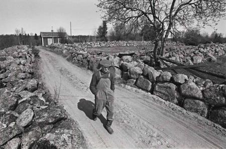 Julius Hurr vandrar på Moippevägen i Kvevlax Överby våren 1977. I bakgrunden Edit Hjorts stuga. Odlingsröskomplexet är ett av de bäst bevarade i Österbotten. Åkerröjningen inleddes här på 1700-talet. Julius Hurrs gård (Abrams) ligger intill. Foto Mikael Herrgård.