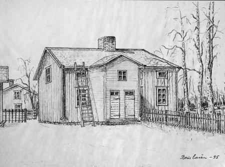 Kvevlax sockenstuga (mittemot prästgården) tecknad av Boris Casén 1995. Sockenstugan revs 1959.