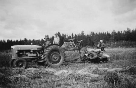 Julius Lunelund (Maran) poserar på Sigurd Ekmans (Kulländan) traktor 1960. Bakom Sigurds son Martin. På självbindaren Krister Ahlskog (Marabackan) och den äldre Nils-Erik Bäckman (Maran).
