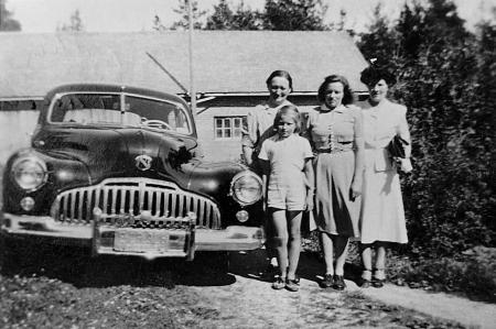 Ethel (Kvevlax) och Torvig (Sverige) Selander från Amerika på besök 1947 hos Herrgårds i Tranasbackan. Vänster: Emilia, Ulla, Gunnel, Ethel. Bilen, en Buick, hade Selanders med sig på båten från Amerika. Foto av Torvig.