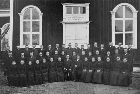 Skriftskolbild från Kvevlax kyrka, troligen 1908. T.f. klockare Erik Nylund och t.f. kyrkoherde Alfred Teodor Appelberg.