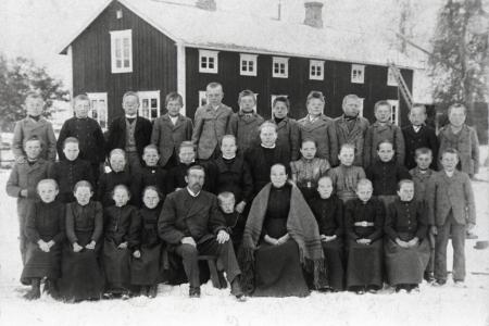Västerhankmo folkskola 1903-04. Ny skola byggdes 1911, skolan i bakgrunden blev Västerhankmo Andelshandel och fungerar idag som byagård. Första raden från vänster: Ingeborg Sandbäck, Ida Näsman, Hilma Näsman, Signe Antell, läraren Anders Antell, Gunnar Antell, Greta Antell lärarfru, Ida Bergström, Ida Kvist, Betty Lind. Mellersta raden: Viktor Ahlskog, Ida Råback, Helmi Krus, Hilma Bergman, Edla..., Ester Antell, Ida Svedlund, Hilma Sandback, Edit backman, Edla Sandberg, Isak Svan-Rosendahl, Johannes Nyqvist. Överst: Botolf Nygård, August Sundvik, Arvid Antell, Johannes Mälsor, Johannes Sand, okänd, Alfred Nygård, Alfred Westermark, Viktor Svedlund, Otto Nygård (?), Alfred Sandberg, Rafael Cederström.