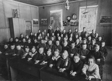 Vassor folkskola i slutet av 1920-talet. I bakgrunden lärarna Viktor och Irene Ahlskog.