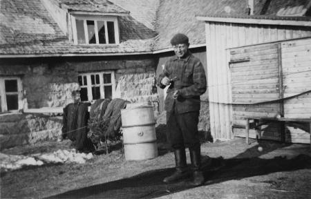 Fiskarbonden Gunnar Finne i Österhankmo arbetar med strömmingssköten. Bild från 1950-talet.